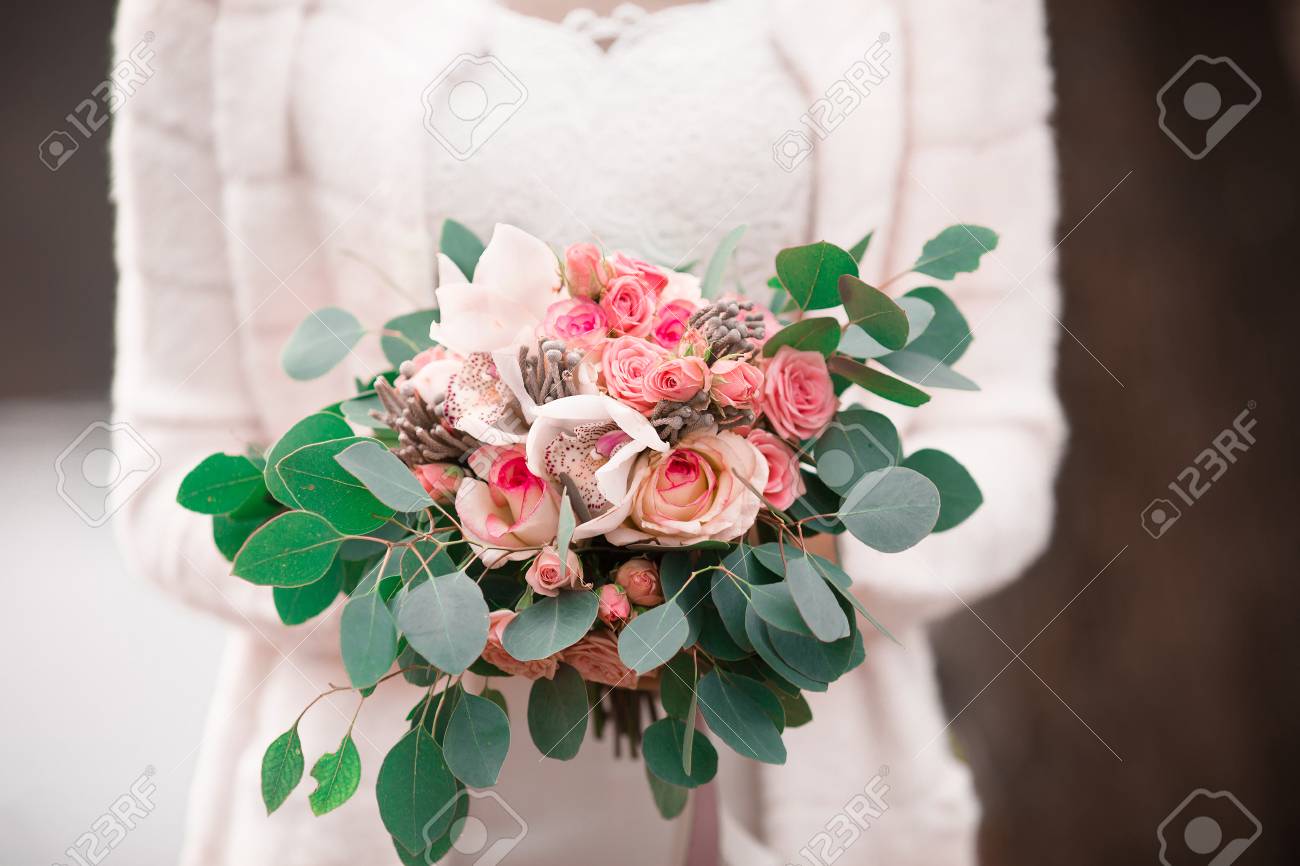 Magnifique Jolie Mariée Avec Bouquet De Mariée Fleurs De Mariage Faible Profondeur De Champ Gros Plan Bouquet De Mariage Bouquet De Mariée De