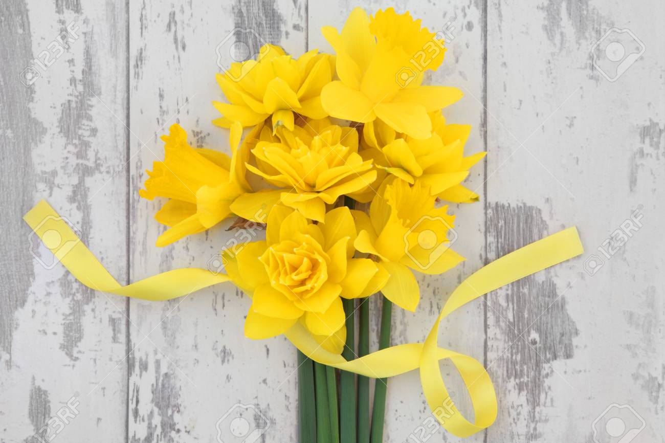 Jaune Jonquille Bouquet De Fleurs Et Ruban Boucle Sur Fond De Bois En Détresse