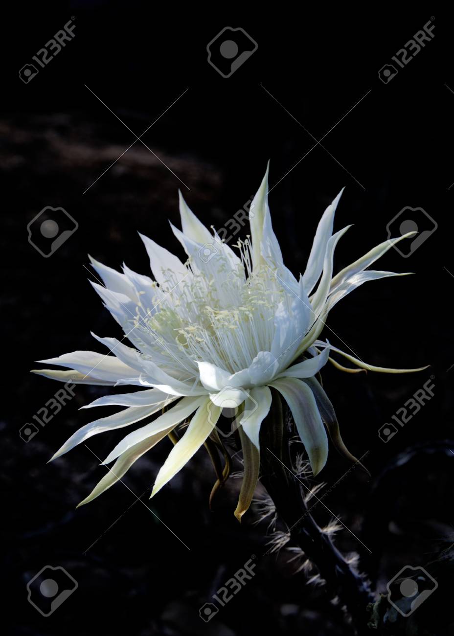 Un Cereus De La Nuit Fleurit Aussi Appelé La Reine De La Nuit Montre Une Seule Fleur Blanche Accentuée Par La Lumière De Laube Contre Les Ombres