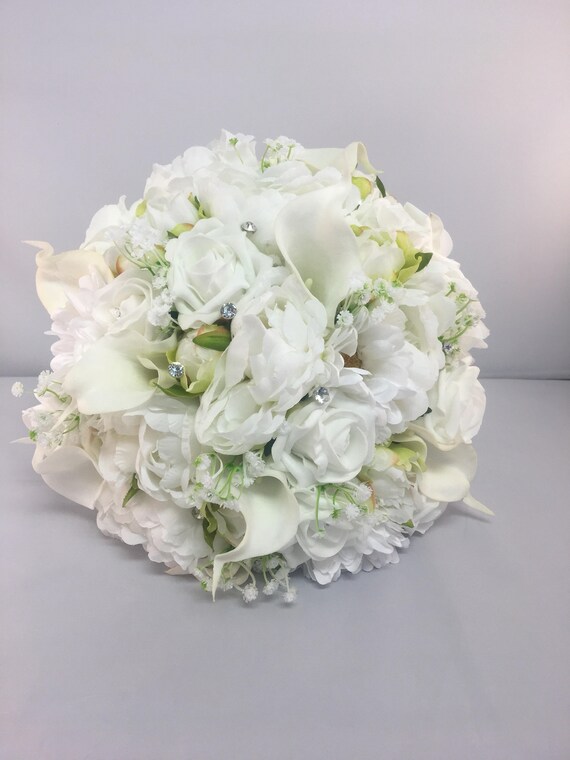 Mariée Bouquet Mariage Artificiel Fleurs Blanches Roses Lys Calla Gerbera Gypsophile Pivoines Diamantes Dentelle Vintage Broche Posie Belle