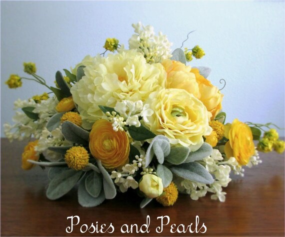 Jaune Gris Argenté Et Ivoire En Cascade Bouquet Fleur En Soie De La Mariée Boutonnière Pivoines Renoncules Lilas Bouton De Billy Vivante