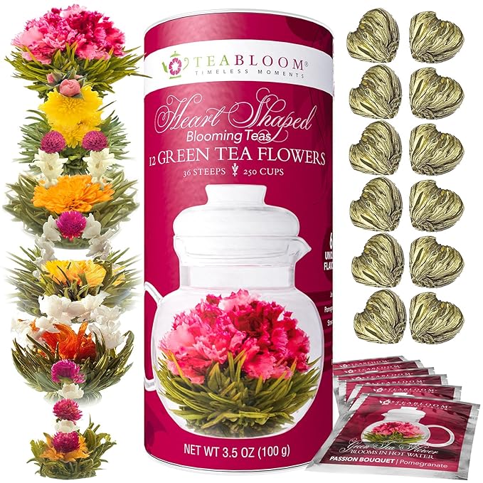 Teabloom Heart Shaped Flowering Tea 12 Assorted Blooming Tea Flowers Green Tea Jasmine Pomegranate Strawberry Rose Litchi Peach Gift For