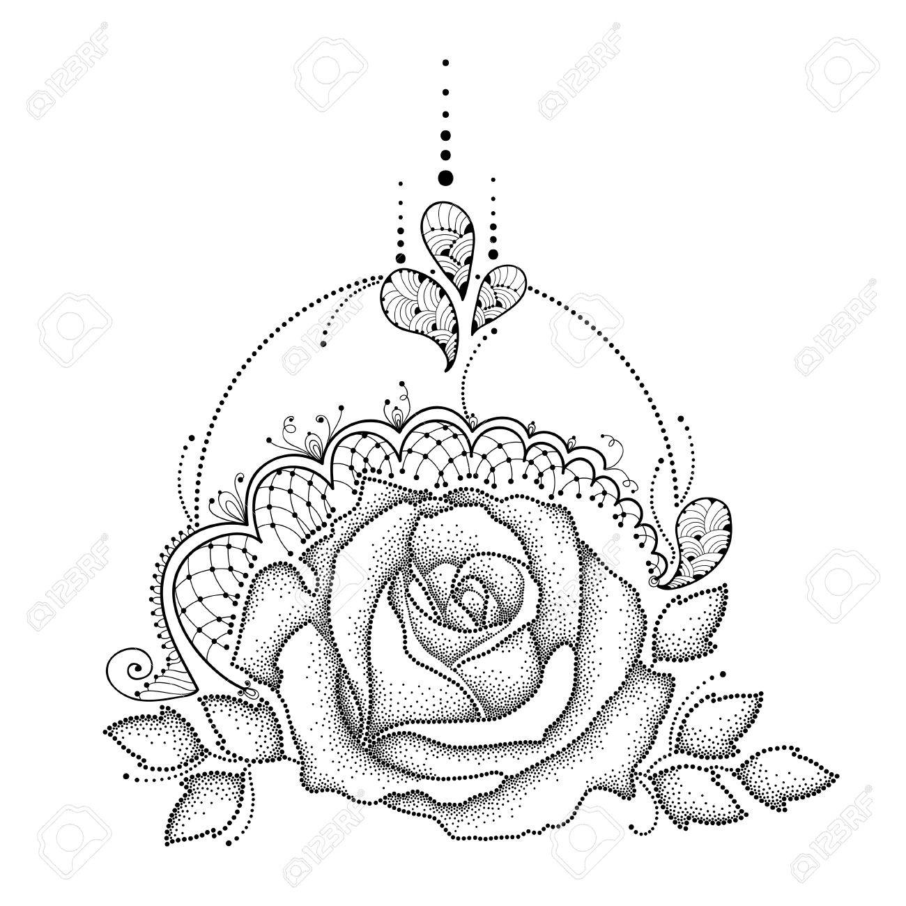 Vector Illustration Avec Pointillés Fleur Rose En Noir Feuilles Dentelle Orné Décoratif Et Remous Isolé Sur Fond Blanc éléments Floraux En Dotwork