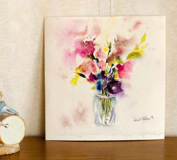 Aquarelle Originale De Bouquet De Fleurs Peinture Originale Fleurs Bouquet Rose Et Violet Nature Morte Abstrait Fleurs